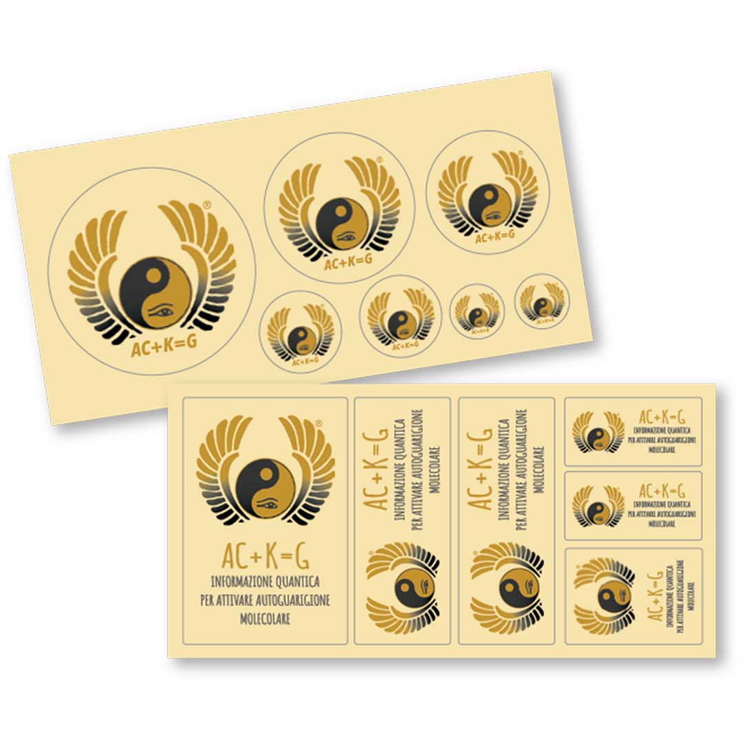 Disponibile in versione adesiva (Etichette Quantiche) o non adesiva (Disco plastificato), agisce attraverso il Logo e la Formula Quantica AC+K=G, che attivano l’Intelligenza quantica della materia, trasformando acqua, bevande e alimenti in alimenti vibrazionali.